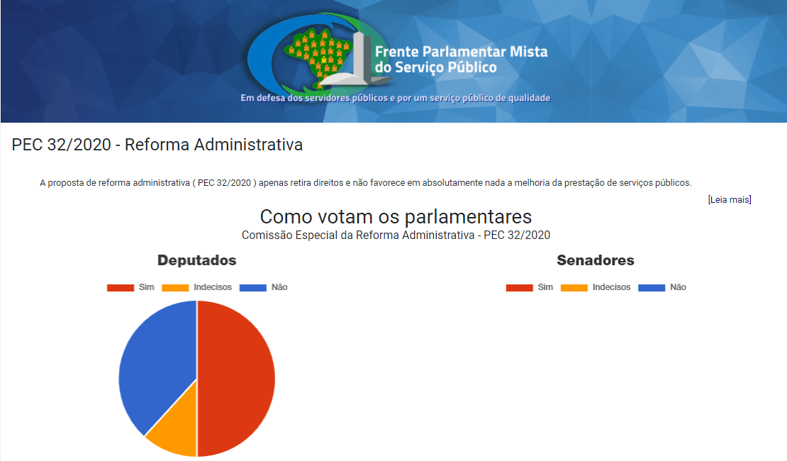 A Frente Parlamentar Mista do Serviço Público fez um mapeamento do posicionamento de Deputados(as) e Senadores(as) sobre a Reforma Administrativa e apresenta junto com os canais de comunicação e redes sociais públicas destes Parlamentares.