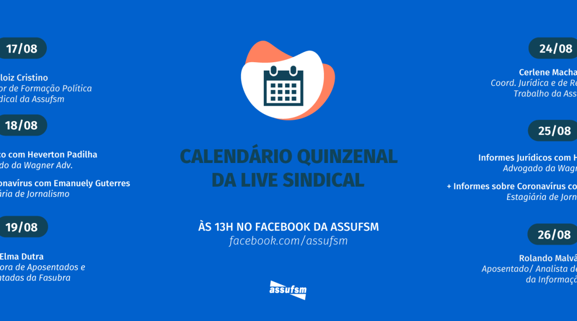 A Assufsm segue debatendo pautas de interesse da categoria na Live Sindical. De terça à quinta-feira, às 13h, pelo facebook  do sindicato. Confira as pautas e convidados e convidadas das próximas semanas. Veja: