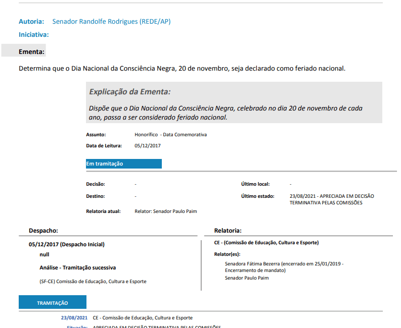 O Dia Nacional de Zumbi e da Consciência Negra, celebrado anualmente em 20 de novembro, poderá se tornar feriado nacional. Atualmente, a data é comemorada apenas em cinco estados e mais de mil municípios brasileiros. Mas essa realidade pode mudar com a aprovação, do Projeto de Lei do Senado (PLS) 482/2017, de autoria do senador Randolfe Rodrigues (Rede-AP), em decisão terminativa na Comissão de Educação, Cultura e Esporte (CE). O PL ainda está tramitando no Plenário do Senado.