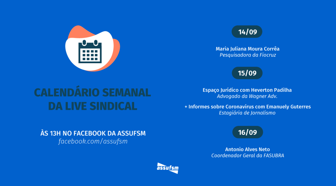 A Assufsm segue debatendo pautas de interesse da categoria na Live Sindical. De terça à quinta-feira, às 13h, pelo facebook do sindicato. Confira as pautas e convidados e convidadas da próxima semana. Veja: