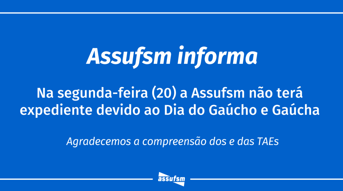 Devido ao feriado do Dia do e da Gaúcha, a Assufsm informa que não terá expediente na segunda-feira, dia 20 de setembro.