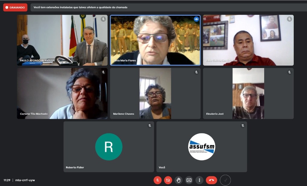 Na manhã de quinta-feira (16), a Coordenação da Assufsm esteve reunida virtualmente com a Reitoria da Universidade Federal de Santa Maria (UFSM) para conversar a respeito do possível retorno presencial na UFSM. O reitor Paulo Afonso Burmann e o vice-reitor Luciano Schuch conversaram por pouco mais de uma hora com o Coordenador Geral Beto Fidler, com a Coordenadora Geral Tania Flores, com o Coordenador de Formação Política e Sindical Eloiz Cristino, com a Coordenadora Jurídica e de Relações de Trabalho Cerlene Machado (Tita), com a Coordenadora de Assuntos de Aposentadoria e Pensão Marilene Chaves e com o Coordenador Financeiro e Patrimonial da Assufsm Eleutério Jost. Também participou da reunião a professora do Centro de Ciências Naturais e Exatas (CCNE/UFSM) e atual Pró-Reitora de Graduação (PROGRAD) e Chefe de Gabinete Martha Bohrer Adaime.
