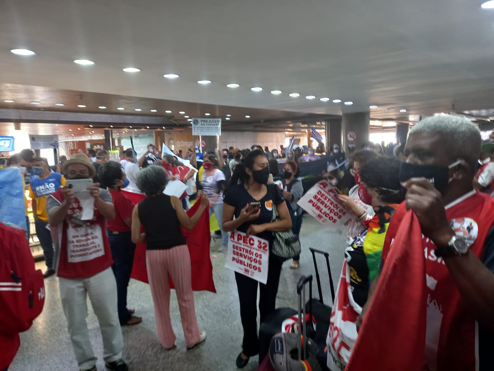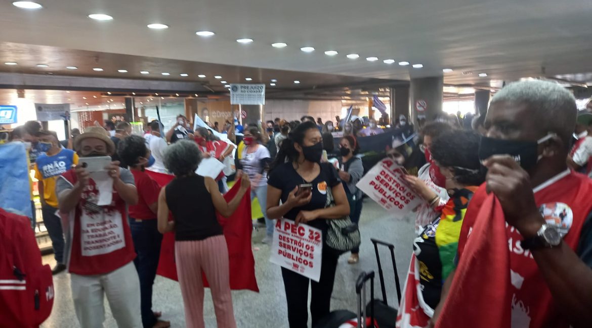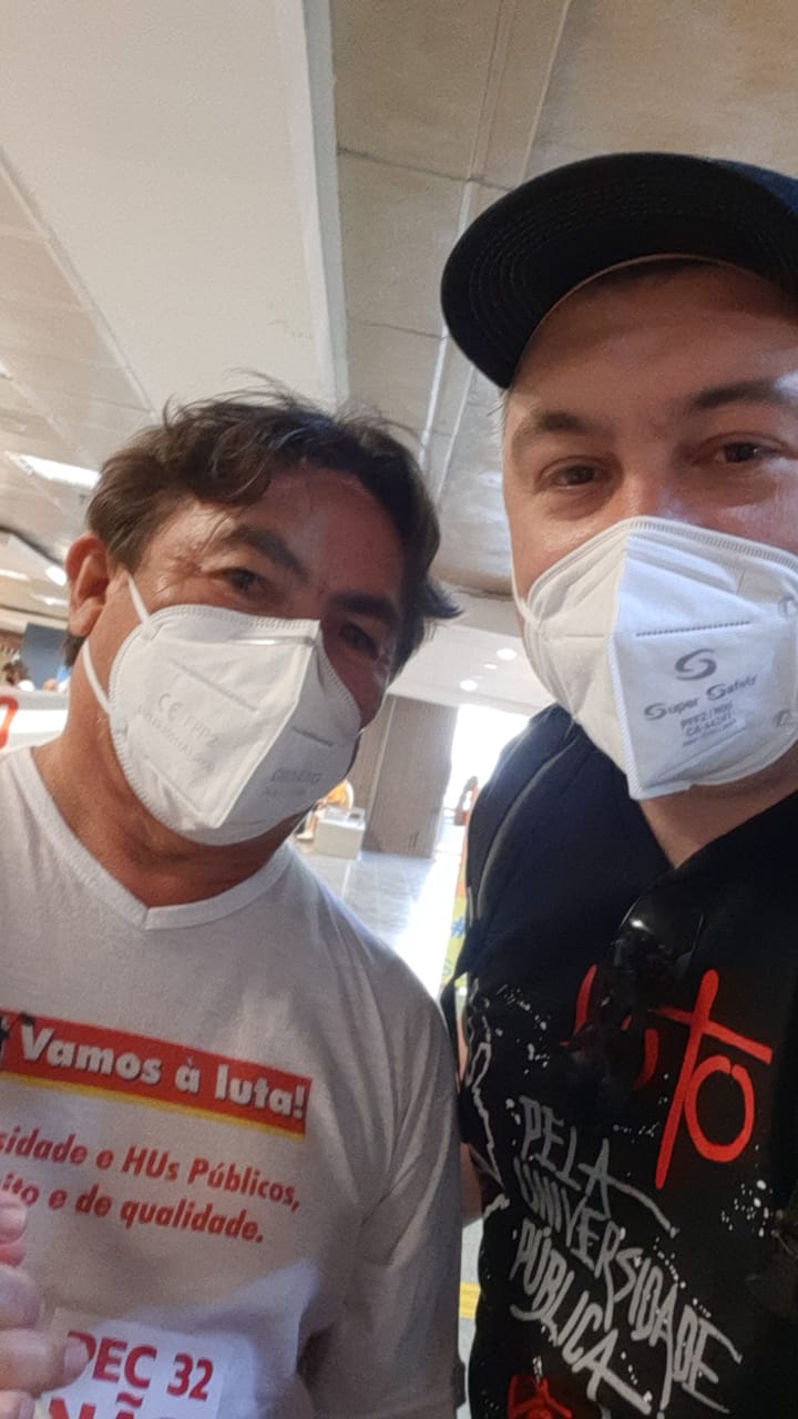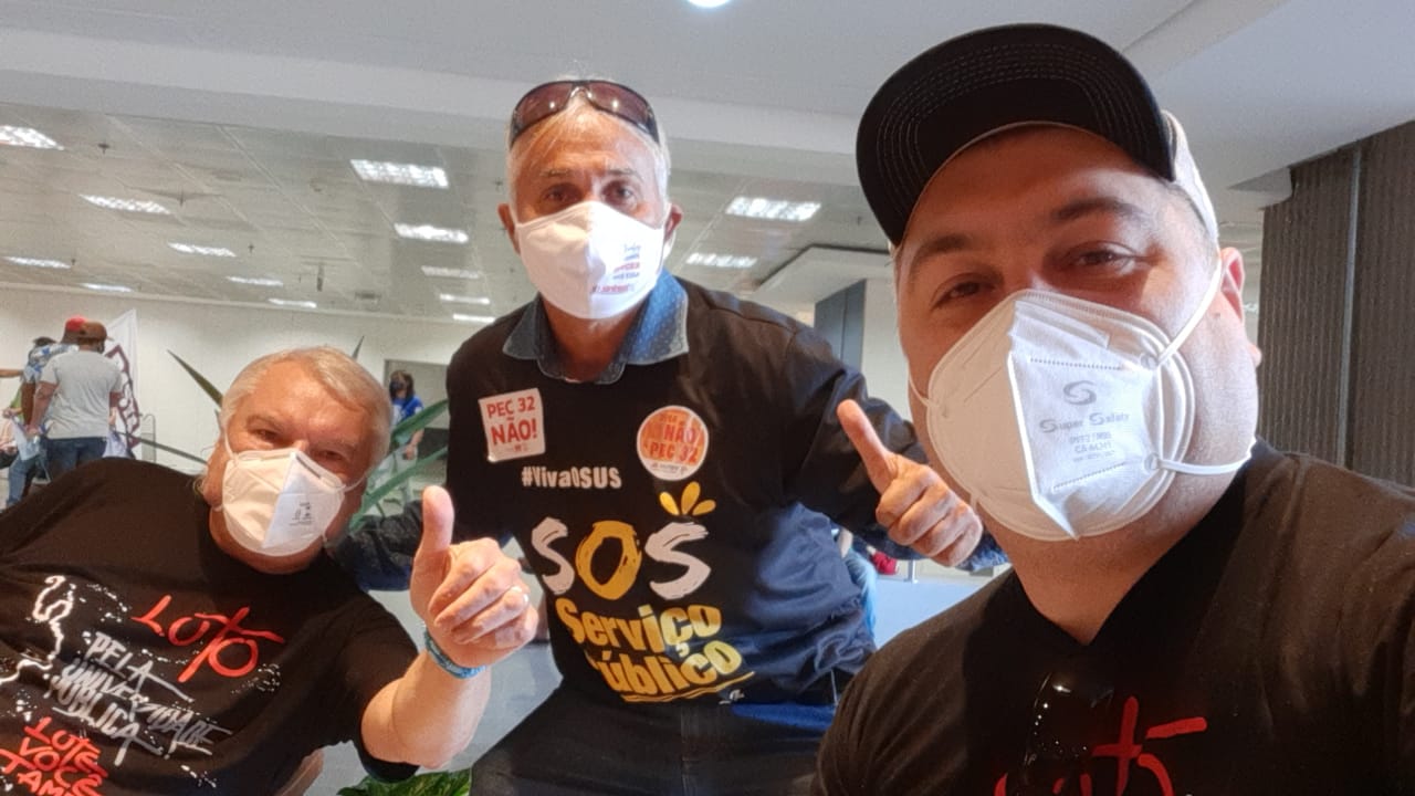 Os três dias de pressão dos servidores e servidoras municipais, estaduais e federais e representantes de centrais sindicais, em Brasília, funcionaram e a votação do relatório da Proposta de Emenda à Constituição (PEC) nº 32, da reforma Administrativa na comissão especial da Câmara dos Deputados, prevista para quinta-feira (16), foi adiada para a essa semana. A categoria e representantes das centrais já preparam novas ações para semana que vem em todo o país, especialmente em Brasília. Se você não pode estar presencialmente na luta, pressione os e as parlamentares virtualmente, clicando aqui. Parlamentares contrários à PEC 32 reforçaram que a mobilização nas ruas e nas redes do conjunto dos servidores e sindicalistas foi determinante para o adiamento da votação do projeto da dupla Jair Bolsonaro (ex-PSL)/Paulo Guedes, ministro da Economia. A Assufsm realizou uma entrada AO VIVO com o Coordenador Geral da FASUBRA Antonio Alves Neto, o Toninho, que contou como estava a mobilização contra a PEC 32. Formigas Vermelhas Deputados(as) governistas foram alvo da pressão implacável de dezenas de dirigentes sindicais que se espalharam pelos corredores da Casa feito formigas, com suas bandeiras vermelhas e palavras de ordem, para exigir o voto contrário dos parlamentares à PEC que privatiza direitos essenciais, como saúde, educação e segurança, e fere de morte o atual modelo de serviço público previsto na Constituição Cidadã. “Eles podem parecer gigantes, mas nós somos muitas formigas e quem não pode com a formiga não atiça o formigueiro!”, avisou a presidenta da Confederação dos Trabalhadores no Serviço Público Municipal (Confetam/CUT), Jucélia Vargas. O deputado Gervásio Maia (PSB-PB) destacou o incômodo de muitos parlamentares com a pressão, principalmente nas redes sociais. Segundo o parlamentar, muitos deputados chegaram a insinuar que ‘robôs’ estariam sendo usados na campanha de pressão contra a PEC 32. Mas o engajamento da categoria e o trabalho de esclarecimento junto à sociedade são os responsáveis diretos desse resultado, diz nota da Confederação dos Trabalhadores no Serviço Público Federal (Condsef). A mobilização e a pressão vão continuar essa semana em todo o país, especialmente em Brasília. De acordo com a Confetam, os sindicatos, federações e confederações CUTtistas que representantes os servidores públicos das três esferas de governo em todas as áreas de atuação já começaram a convocar suas bases a voltarem à Brasília para acompanhar a votação na terça-feira (21) e intensificar a pressão pela derrota da PEC 32. Uma comitiva da Assufsm está presente na luta para tentar barrar a PEC 32. “Nós participamos, desde às 7h da manhã, de uma manifestação no aeroporto. Passou bastante deputado, políticos e senadores. Foi muito boa essa manifestação, servidores(as) de todas as esferas se manifestando lá. Logo mais tarde, às 14h a gente vai descer para a Câmara para acompanhar a leitura do relatório, que estava programada para hoje da comissão especial”, relata o TAE Maurício Severo, que está junto do Coordenador de Esporte, Cultura e Lazer da Assufsm Roberto Bordin, da Coordenadora de Secretaria da Assufsm Sonia Molinari e do Coordenador Financeiro e Patrimonial da Assufsm Elton Quadros, o Escadinha. Sem votos, Lira adia votação da PEC 32 “Não podemos errar no placar”, disse o presidente da Casa, deputado Arthur Lira (PP-AL), deixando claro que adiou a votação por não ter votos suficientes para aprovar a proposta que destrói o serviço público do país e ataca os direitos dos servidores e servidoras. E foi por não ter votos suficientes para garantir a aprovação, que Lira convenceu o presidente da comissão, deputado Armando Monteiro (PP-PE), e o relator da matéria, deputado Arthur Maia (DEM-BA), a adiarem a votação para esta terça-feira (21). Na data, o relator deve apresentar uma terceira versão do relatório, com novas mudanças de conteúdo para tentar agradar o mercado e vencer a resistência dos próprios deputados da base de apoio ao desgoverno Bolsonaro. “Na próxima terça, é necessário ter mais companheiros e companheiras aqui (em Brasília). Vamos fazer rodízios. Os estados que vieram podem retornar e os outros que não vieram devem vir à Brasília porque essa é uma luta incessante. A gente volta pra casa, mas não pro descanso porque a gente não arreda pé da resistência e da luta para derrotar essa PEC”, convocou a secretária de Combate ao Racismo da Confetam, Vilani Oliveira. Ações nos municípios Secretário adjunto de Comunicação da Confetam, Vlamir Lima enfatizou que tão importante quanto a luta em Brasília é a mobilização das trabalhadoras e trabalhadores das prefeituras nos estados. “É importante essa mobilização também continuar nos estados e municípios para garantir que os servidores de todo Brasil das três esferas – federal, estadual e municipal -, continuem a pressão em cima dos deputados para que votem contra a Reforma Administrativa”. Caso seja aprovada na comissão especial da Câmara nesta terça-feira (21), a PEC 32 pode ser levada a Plenário logo no dia seguinte, caso esta seja a decisão do presidente Arthur Lira, que tem a prerrogativa de definir quais matérias entram na pauta de votação da Casa. Confira mais fotos feitas pela comitiva da Assufsm, em Brasília: