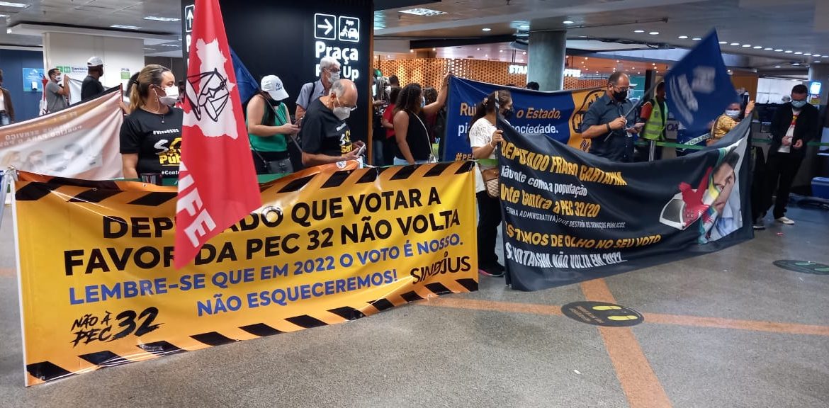 Servidoras e servidores públicos federais, estaduais e municipais aumentaram a mobilização em defesa dos serviços públicos e contra a PEC 32, com atos no Aeroporto Internacional de Brasília e no anexo II da Câmara dos Deputados. O objetivo é fortalecer a batalha para derrubar a PEC, que já teve a leitura e votação do parecer adiados na Comissão Especial mais de uma vez, o que representa uma vitória das categorias contra a destruição dos serviços públicos.