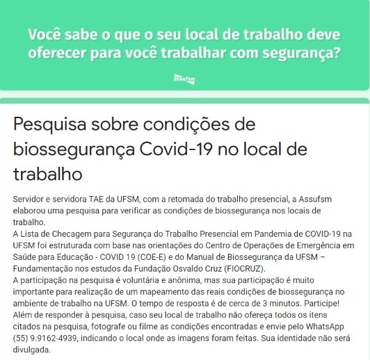 Técnico Administrativos e Administrativas em Educação da UFSM, com a retomada do trabalho presencial, a Assufsm elaborou uma pesquisa para verificar as condições de Biossegurança nos locais de trabalho.