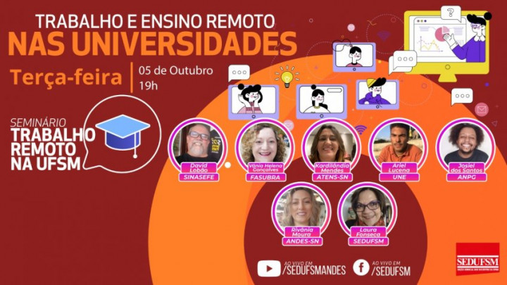 Na próxima terça, 5 de outubro, às 19h, a Seção Sindical dos Docentes da UFSM (Sedufsm) promove a segunda etapa do seminário que aborda o “Trabalho Remoto na UFSM”. A primeira, que abriu os debates, foi no dia 23 de setembro, com a abordagem específica sobre o trabalho remoto na UFSM, com a participação das entidades representativas locais. Além da programação de terça, 5, o seminário se estenderá em mais duas outras etapas: dias 14 e 27 de outubro.