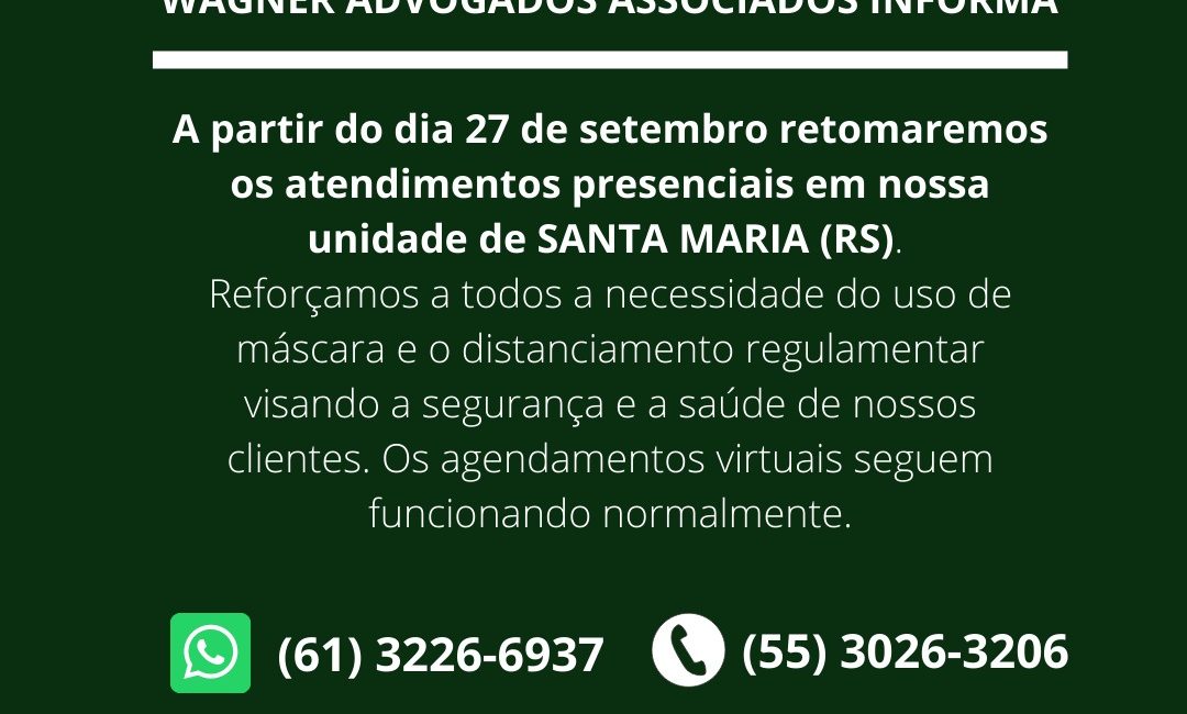 O escritório WAA já está com atendimentos presenciais, na unidade de Santa Maria, desde o dia 27 de setembro. Para isso, é necessário que quem necessitar utilizar os atendimentos presenciais AGENDE horário pelos contatos – WhatsApp – (61) 3226-6937 ou (55) 3026-3206. Os demais contatos virtuais seguem disponíveis. Quem precisar de atendimento pode enviar e-mail para: secretaria@wagner.adv.br. É necessário que quem se deslocar até o escritório, respeite o horário agendado para que a higienização correta do ambiente possa ser feita.