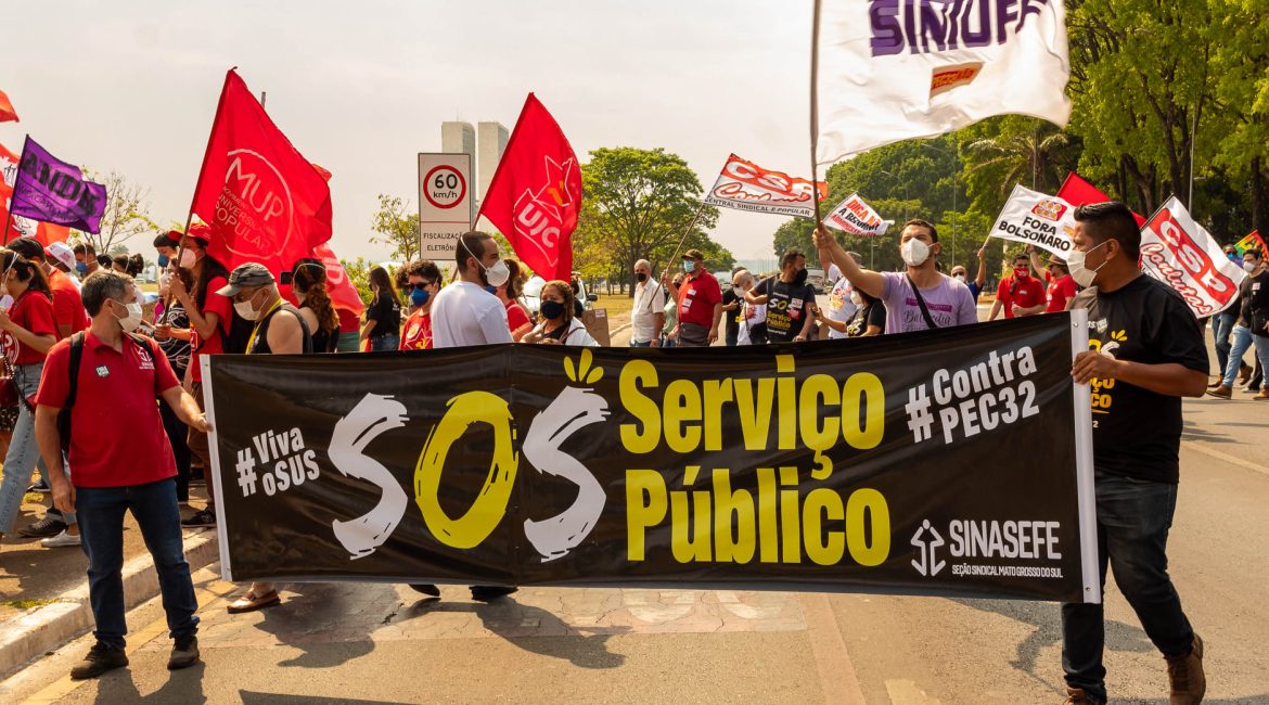 Reunidos no Espaço do Servidor, todos e todas caminharam em direção ao local de trabalho do Ministro Paulo Guedes, autor da Reforma Administrativa (PEC 32). No local, uma geladeira foi instalada com ossos e notas de dólares falsos manchadas de sangue foram jogadas ao ar.