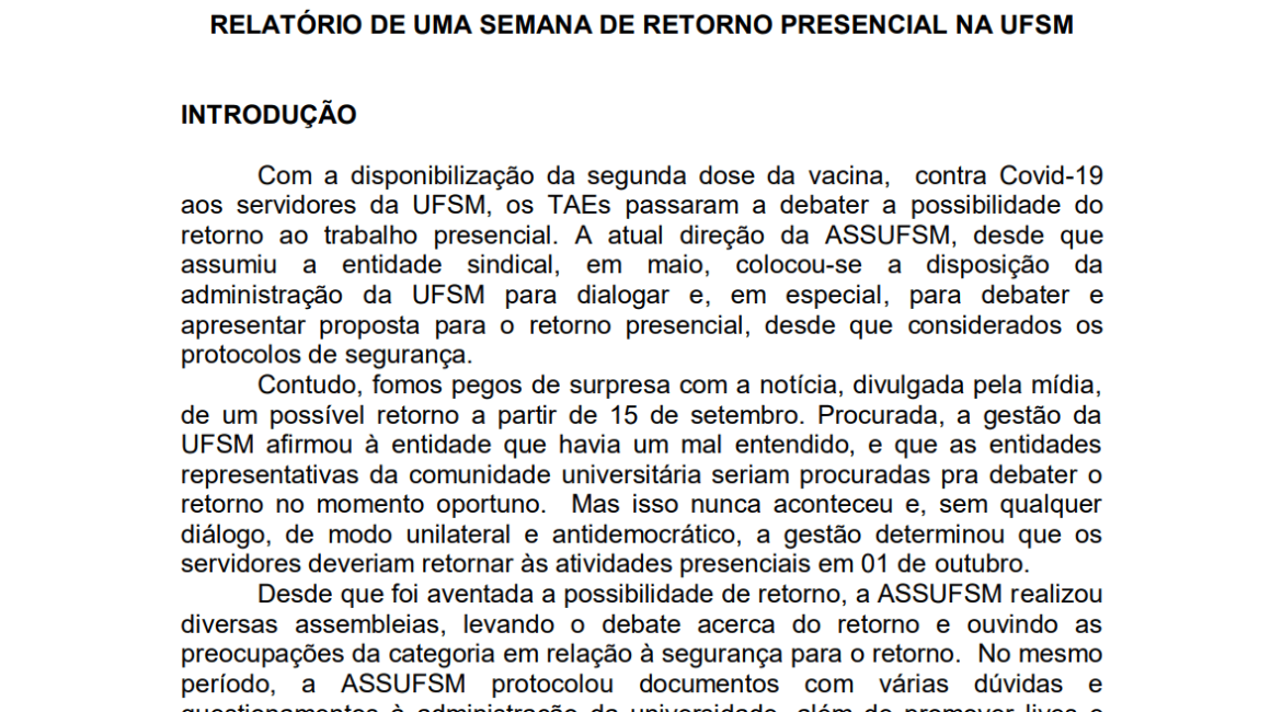 A Coordenação da Assufsm enviou nessa sexta-feira (15) um relatório, à reitoria, sobre a primeira semana de retorno presencial na Universidade Federal de Santa Maria. O documento foi um encaminhamento da 9ª Assembleia Geral Virtual da Assufsm e, nele, constam todas as demandas que a categoria levantou sobre a situação sanitária em seus ambientes de trabalho, bem como no transporte coletivo e tudo o que afeta a segurança sanitária dos e das TAEs da UFSM.