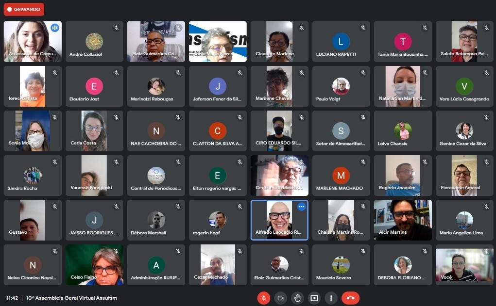 A sexta-feira (15) chuvosa reuniu virtualmente a Coordenação da Assufsm com a categoria de Técnico Administrativos e Administrativas em Educação da UFSM para debater sobre assuntos pertinentes que preocupam a base do sindicato. Dentre as pautas estava a retirada de delegados e delegadas para participarem da Plenária Virtual da FASUBRA, que, de acordo com Informe de Direção recebido por e-mail, foi adiada e irá acontecer nos dias 9 e 10 de novembro.