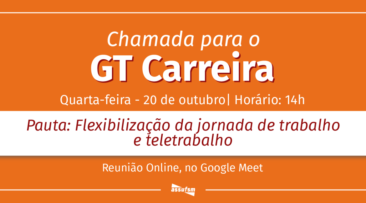 O Grupo de Trabalho Carreira (GT Carreira) da Assufsm terá novo encontro virtual nessa quarta-feira, 20 de outubro, às 14h. Em pauta estão: Flexibilização da Jornada de Trabalho e Teletrabalho.