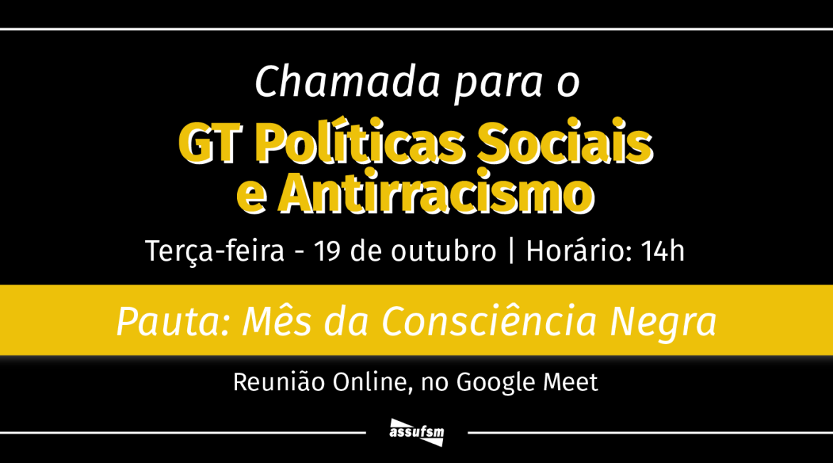 O Grupo de Trabalho Políticas Sociais e Antirracismo (GT Políticas Sociais e Antirracismo) da Assufsm retoma encontro virtual nessa terça-feira, 19 de outubro, às 14h. Em pauta está o Mês da Consciência Negra.