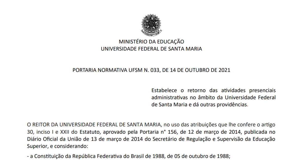Através da Portaria Normativa nº. 033, de 14 de outubro de 2021, a UFSM mantém o funcionamento das atividades administrativas presenciais e escalonadas. A decisão foi tomada tendo em vista que o acesso à vacina contra a Covid-19 foi disponibilizado para 100% dos servidores(as) da Instituição, e estes já receberam a imunização total.