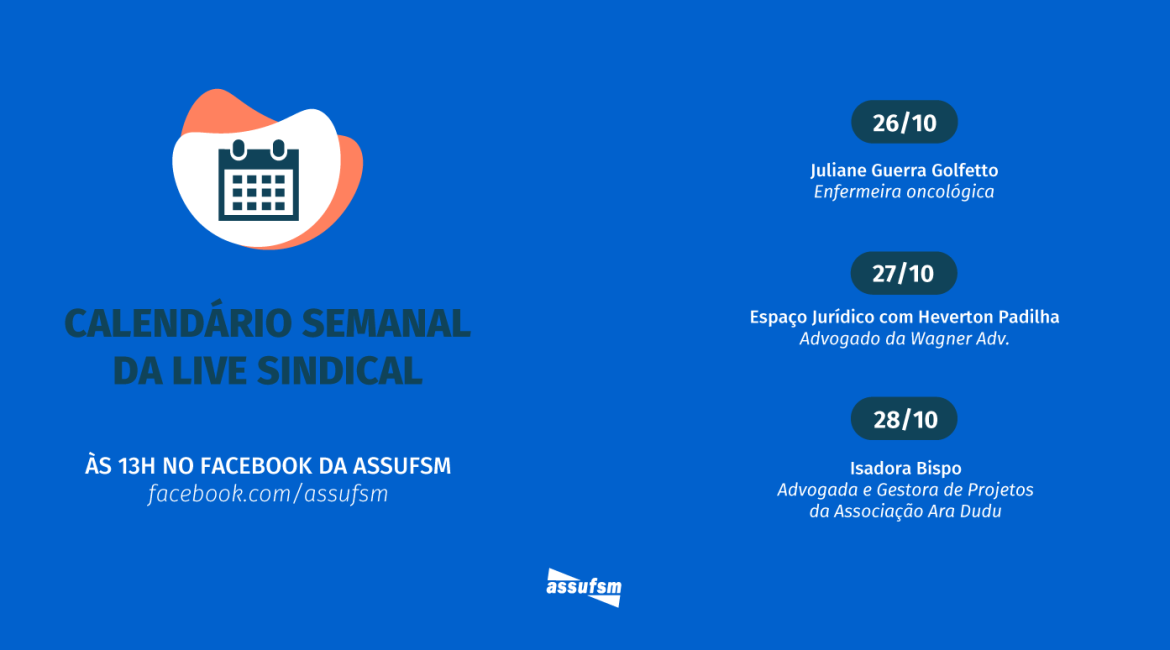 A Assufsm segue debatendo pautas de interesse da categoria na Live Sindical. De terça à quinta-feira, às 13h, pelo facebook do sindicato. Confira as pautas e convidados e convidadas dessa semana. Veja: