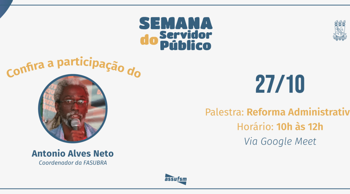 Na programação da Semana do Servidor e da Servidora Pública, a UFSM debaterá sobre a Reforma Administrativa, a PEC 32. E para isso, dentre os e as convidadas para falar sobre o assunto, a Assufsn indicou o Coordenador Geral da FASUBRA, Antonio Alves Neto, o Toninho.