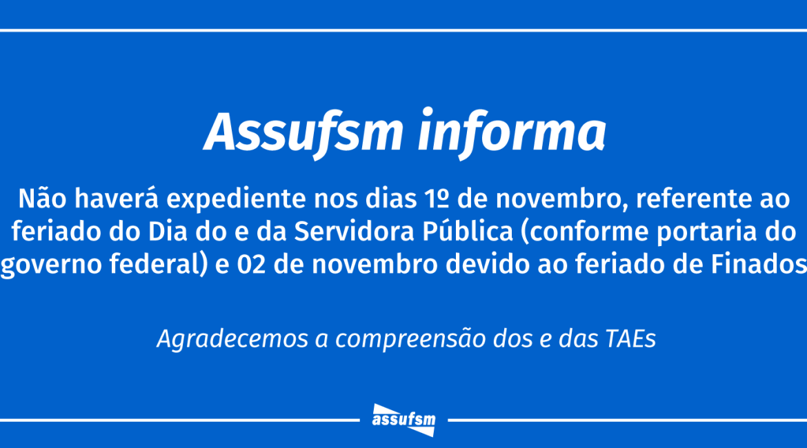 Assufsm informa que nos dias 1º e 2 de novembro não terá expediente devido ao feriado referente ao Dia do e da Servidora Pública, conforme portaria 430 de 2020, comemorado dia 28 de outubro e passado para o dia 1º de novembro, de acordo com a publicação feita pela UFSM. Já o dia 2 de novembro é Dia de Finados.