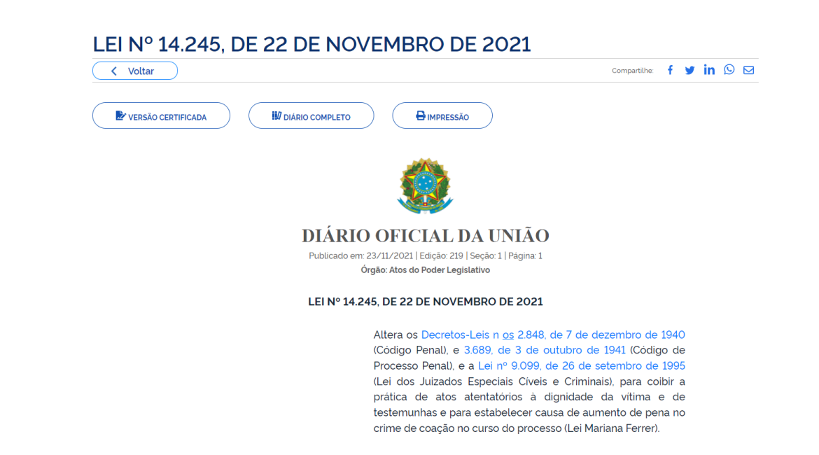 O projeto de lei que reprime a prática de atos atentatórios à dignidade da vítima e de testemunha durante o julgamento foi sancionado. A nova lei foi publicada no Diário Oficial da União de hoje (23). A Lei nº 14.245 possibilita, também, o aumento da pena no crime de coação quando praticado durante o processo. O aumento pode variar de um terço da pena até a metade, caso o processo envolva crime contra a dignidade sexual. De acordo com a Secretaria Geral da Presidência da República, a iniciativa pela criação desta lei surgiu após o caso da influenciadora digital Mariana Ferrer, que foi alvo de ofensas e humilhações por parte do advogado do acusado durante audiência judicial, em que afirmava ter sido vítima de violência sexual. “De acordo com a justificativa do projeto, casos como o de Mariana Ferrer podem fazer com que outras vítimas sejam desestimuladas a denunciar agressores por receio de não encontrarem o apoio necessário quando do julgamento”, justificou, em nota, a secretaria. A nova lei estabelece o dever a todos os envolvidos nos julgamentos processuais no sentido de assegurar a integridade física e psicológica das vítimas de violência sexual, bem como das testemunhas durante as audiências. Além disso, institui a responsabilização civil, penal e administrativa nos casos em que houver “desrespeito dos direitos da parte denunciante”. Para tanto, confere, ao juiz, a “atribuição de zelar pelo cumprimento da medida”. Entre as ações previstas pela nova legislação está a de que, nas fases de instrução e julgamento do processo, ficam vedadas a manifestação sobre “circunstâncias ou elementos alheios aos fatos objeto de apuração nos autos, bem como a utilização de linguagem, de informações ou de material que ofendam a dignidade da vítima ou de testemunhas”.