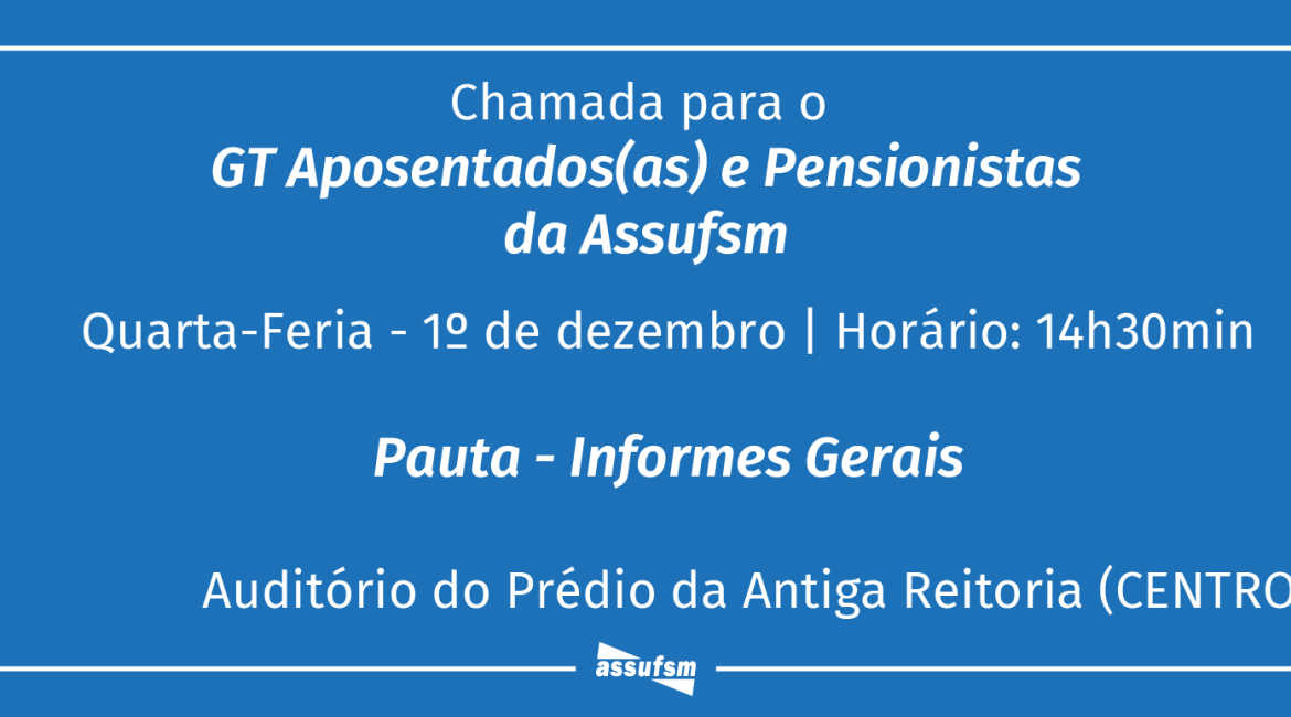 O Grupo de Trabalho Assuntos de Aposentadoria e Pensão (GT Assuntos de Aposentadoria e Pensão) da Assufsm terá novo encontro presencial, após quase dois anos sem se reunir devido a pandemia, nessa quarta-feira, 1º de dezembro, às 14h30min, no Auditório do Prédio da Antiga Reitoria (Centro de Santa Maria).