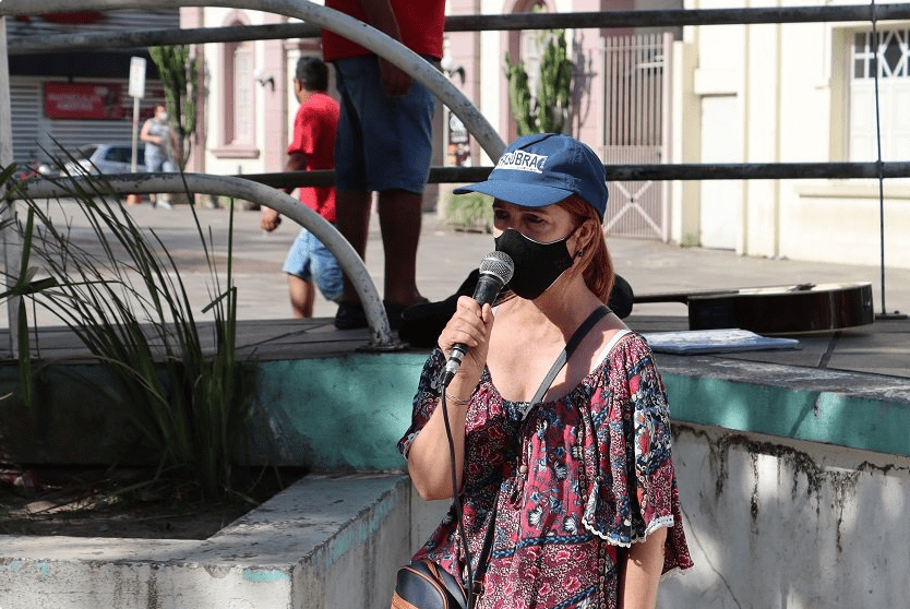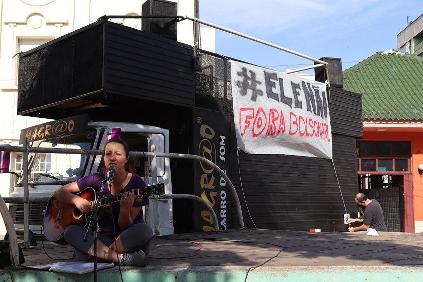 A manifestação, ocorrido na tarde de sábado, 4 de dezembro, na praça Saldanha Marinho, foi convocada pelos diversos movimentos de mulheres, sendo alguns ligados a partidos e sindicatos, tanto em Santa Maria, como no restante do Brasil, e representou o fechamento dos protestos contra o governo de Jair Bolsonaro, iniciados ainda no primeiro semestre deste ano, e que tiveram como mote inicial a defesa da #vacinaparatodos. A palavra de ordem entoada pela diretora da Sedufsm, a professora Márcia Morschbacher, “Ninguém aguenta mais. Fora Bolsonaro e seus generais”, estabeleceu uma relação direta com as políticas destrutivas do atual governo. Ela citou que ninguém aguenta mais o aumento do custo de vida, do desemprego, da fome e dos diversos tipos de violência. Márcia ressaltou que as ações do Executivo federal têm gerado a destruição das políticas públicas e, que, se não houver mobilização, tende a piorar caso sejam mantidos os cortes orçamentários ou se for aprovada a reforma administrativa (PEC 32). Abaixo o machismo, o fascismo e a fome A Coordenadora Geral da Assufsm Loiva Chansis destacou o papel das mulheres na luta cotidiana em favor de uma educação de qualidade, de uma saúde pública e gratuita, mas, também, contra o machismo e o fascismo que, segundo ela, foram exacerbados desde 2019, quando assumiu o governo Bolsonaro. A dirigente da Assufsm fez questão de enviar um abraço aos familiares de vítimas da tragédia da boate Kiss, que estão na tenda próxima ao Calçadão, ou acompanhando o julgamento em Porto Alegre, e que seguem clamando por justiça quase nove anos após o incêndio. “O ato foi de extrema importância para que se pudesse ver o protagonismo das mulheres perante a sociedade. Para que pudéssemos colocar toda nossa força e protagonismo de lutas durante anos de existência. No final do ato, pudemos soltar balões brancos em solidariedade às mães do caso Kiss e também em sinal de protesto, de busca pela justiça e acolhimento às famílias”, retrata Loiva, em entrevista para a Assessoria da Assufsm. A líder comunitária do bairro Nova Santa Marta (que completa 30 anos dia 7 de dezembro), Elisa Pinheiro, chamou a atenção durante o ato para o drama vivido pela população: mães, filhos e pais que passam fome na atual conjuntura do país. “Todos os dias temos pessoas batendo na nossa porta pedindo comida”. Contudo, no entendimento dela, é preciso “perdoar quem votou nesse traste”, se referindo ao presidente Bolsonaro. “Não podemos nos deixar enganar novamente e votar errado”, frisou. “Ele, não”, finalizou. Cultura na praça A manifestação deste sábado também abriu espaço para expressões culturais. A jornalista Melina Guterres apresentou vários poemas durante o evento, sendo um especialmente dedicado à Marielle Franco. A então vereadora (Psol), socióloga e militante feminista, foi assassinada em 14 de março de 2018, na cidade do Rio de Janeiro, mas o crime até hoje não foi completamente elucidado. Foram apresentadas algumas danças de roda, com a presença marcante de estudantes indígenas ligado ao Yandé, coletivo que atua junto à UFSM, que ajudou nas coreografias. A militante da Assufsm, Natália San Martín (foto acima), também deu sua contribuição. Com sua voz e o violão arriscou a canção de Humberto Gabbi Zanatta e Francisco Alves, mas consagrada na voz de Dante Ramon Ledesma: “Talvez um dia, não mais existam aramados E nem cancelas, nos limites da fronteira Talvez um dia milhões de vozes se erguerão Numa só voz, desde o mar as cordilheiras A mão do índio, explorado, aniquilado…”. “O ato foi organizado de forma muito coerente e necessária, porque o que já prevíamos aconteceu, em 2018, onde gritamos por #ELENÃO e agora bradamos por #BolsonaroNuncaMais. Estamos vendo os retrocessos que estão acontecendo, com inúmeros prejuízos, principalmente para as mulheres, com o governo desse presidente. Além dele ter rebaixado o ministério das mulheres, podemos ver o aumento do desrespeito às políticas de gênero, agora está ameaçado com esse governo”, desabafa a TAE Natália San Martin, em entrevista para a Assessoria da Assufsm.
