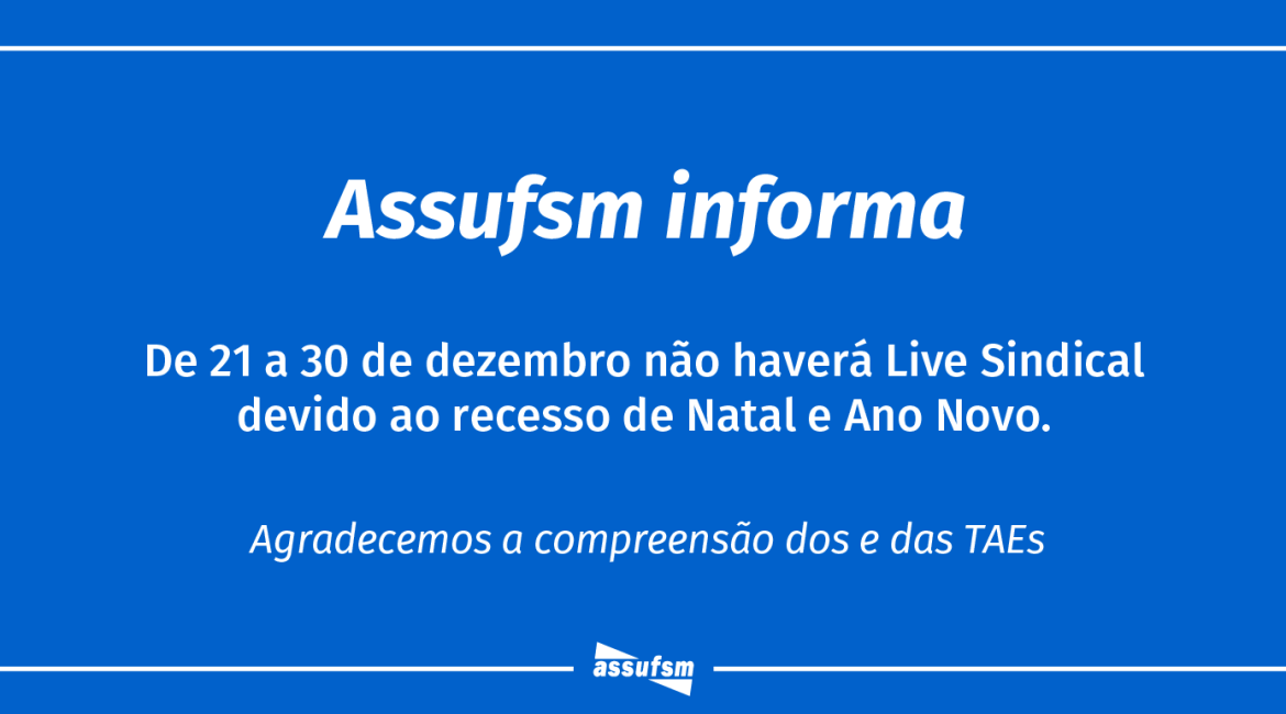 A Assufsm comunica a todos, todas e todes que, devido ao recesso de Natal e Ano Novo de 2021, não terá Lives Sindicais de 21 a 30 de dezembro.