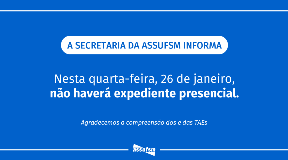 TAE, a Secretaria da Assufsm informa que, excepcionalmente hoje, não terá atendimento presencial na sala 1006, do prédio da Reitoria da UFSM. O motivo é por problemas de saúde.