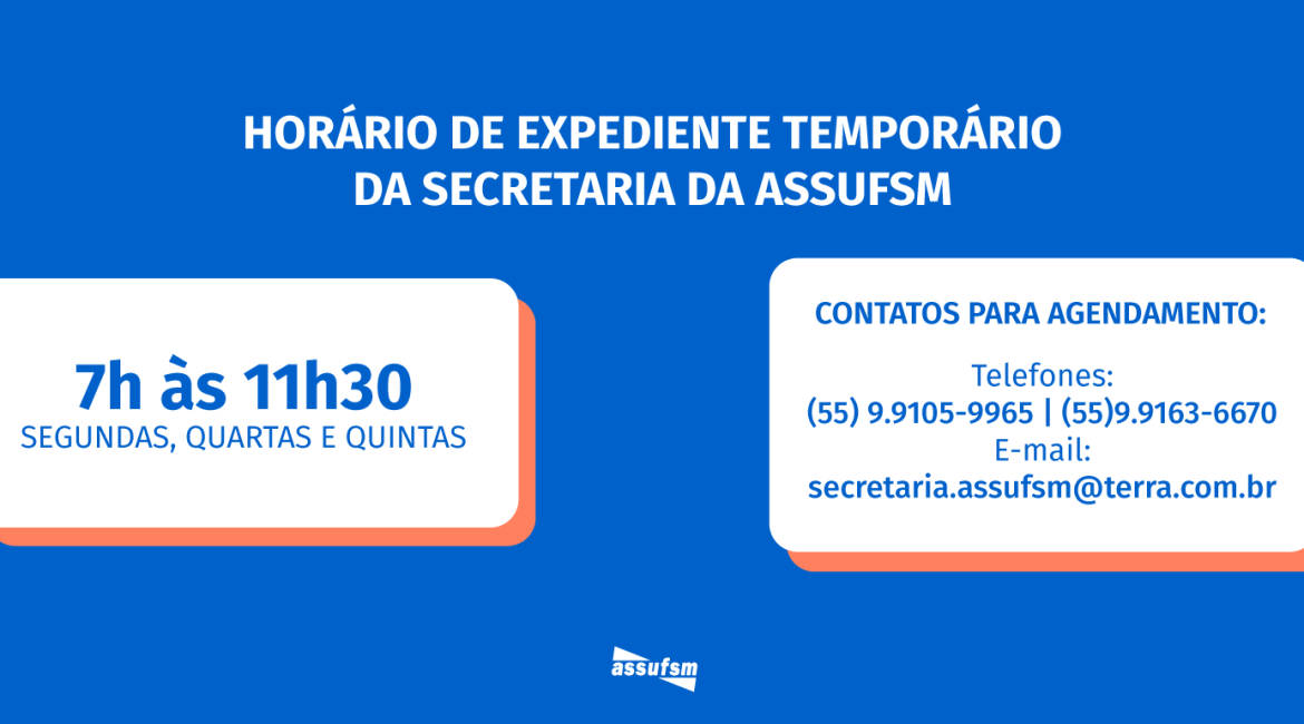 A Secretaria da Assufsm informa que passou a atender presencialmente nas segundas, quartas e quintas-feiras pela parte da manhã, das 7h às 11h30min. Segundas, quartas e quintas de tarde e terças e sextas das 7h às 18h, o atendimento segue remoto.