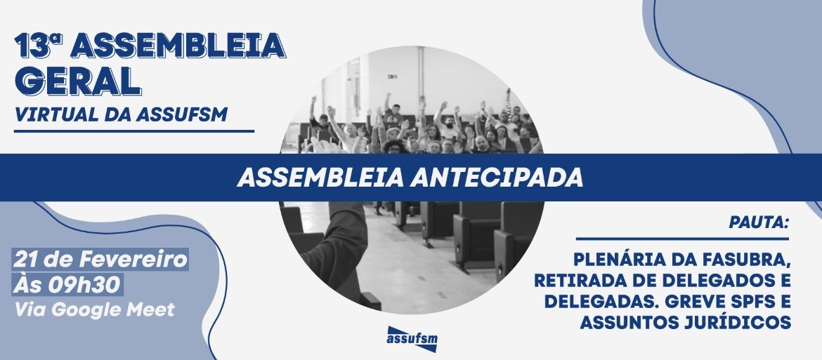 Atenção TAE da UFSM, a 13ª Assembleia Geral Virtual da Assufsm trocou de data e horário devido a reunião ampliada chamada pela FASUBRA, para a tarde de terça-feira, com a participação da Coordenação da Assufsm.