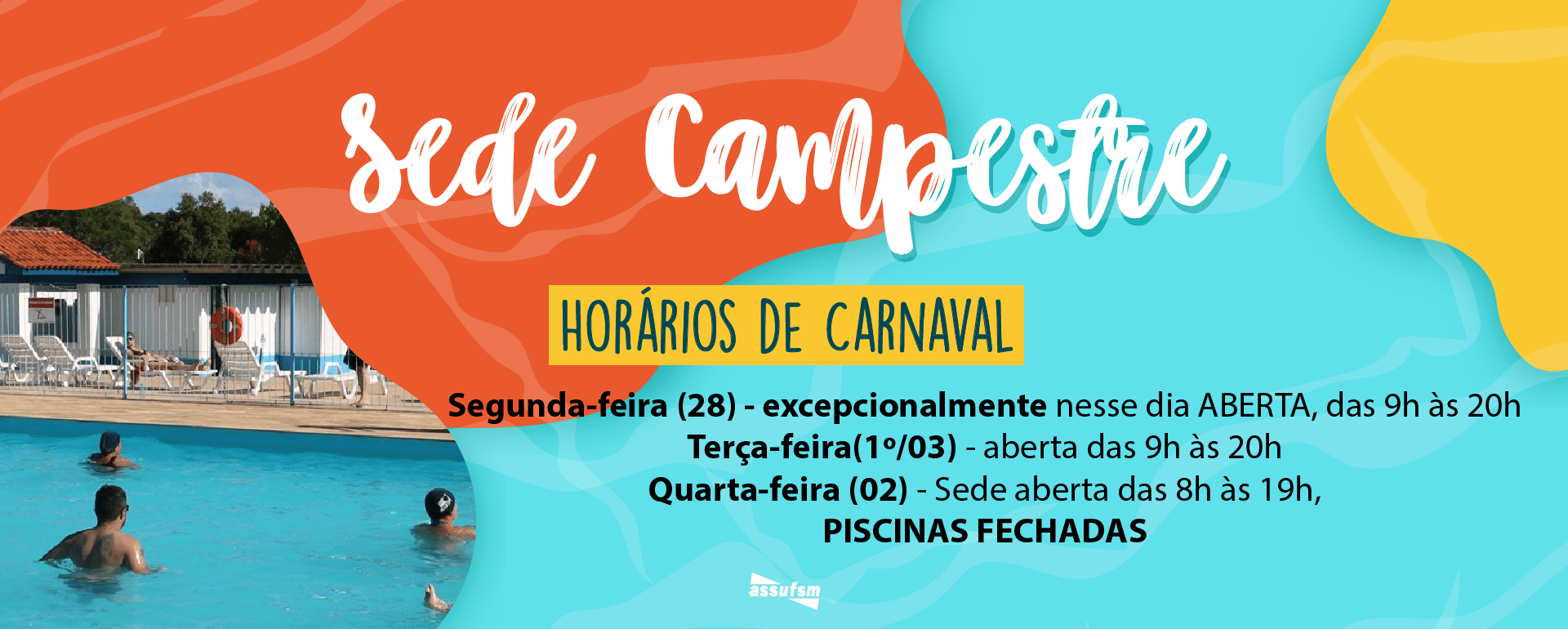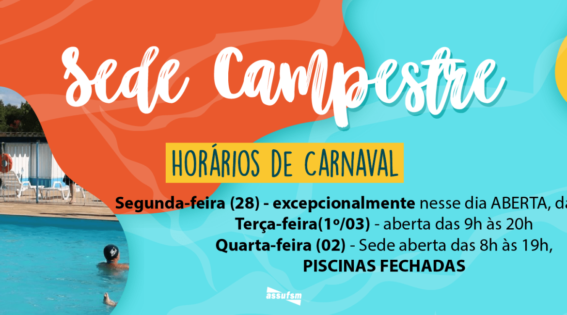 Já a Sede Campestre da Assufsm também terá alterações de horário. Excepcionalmente na segunda-feira, dia 28 de fevereiro, a Sede e as piscinas irão ABRIR ao público, das 9h às 20h.