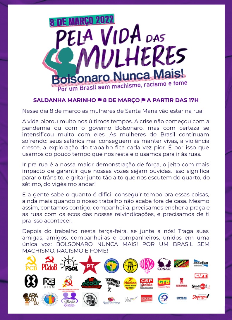 A cidade terá manifesto no dia 8 de março, a partir das 17h, na Praça Saldanha Marinho, clique aqui e confira. A Assufsm está ativa na construção do ato. Para mais informações, acesse aqui o evento no facebook. Abaixo, confira a arte realizada pela Comissão de Comunicação do ato 8M: