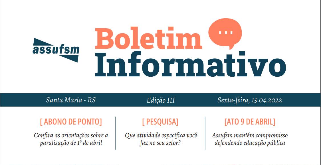 No Boletim dessa quinzena veja informações sobre o abono de ponto em relação a paralisação do dia 1º de abril, a participação da Assufsm no ato do dia 9 de abril, por Fora Bolsonaro, o documento protocolado pela Assufsm e TAEs do HUSM na Comissão Permanente de Flexibilização da Jornada de Trabalho, uma pesquisa para realizar a Campanha de Valorização Permanente de TAEs e mais informações.