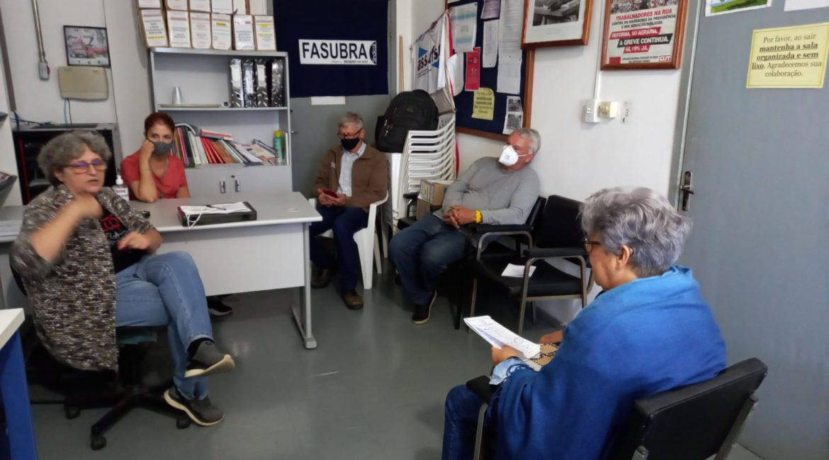Para repassar a informação para o restante da Coordenação da Assufsm, as Coordenadoras Tania, Tita e o Coordenador Jost encontraram-se na Sala de Reuniões da Assufsm com a Coordenadora Geral Loiva Chansis e o Coordenador Financeiro e Patrimonial Elton Rogério, o Escadinha.