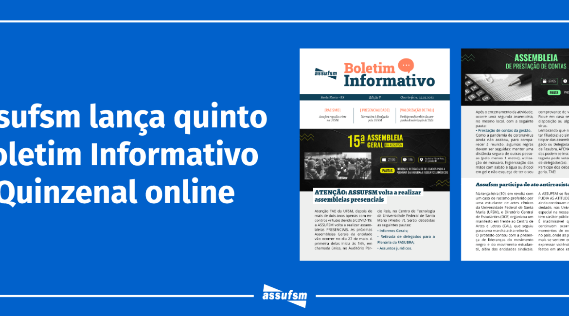 A Coordenação da Assufsm, gestão 2021-2023, em parceria com o Setor de Comunicação do Sindicato, lança hoje a Edição de número 5 do Boletim Informativo Online.