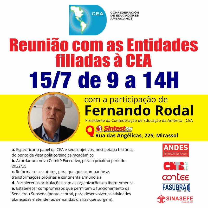 Na sexta-feira (15/7), de 9 às 14h, haverá reunião com as entidades filiadas à CEA (Confederación de Educadores Americanos) com a presença do presidente Fernando Rodal na sede do Sintest/RN (Sindicato Estadual dos Trabalhadores em Educação do Ensino Superior do Rio Grande do Norte)