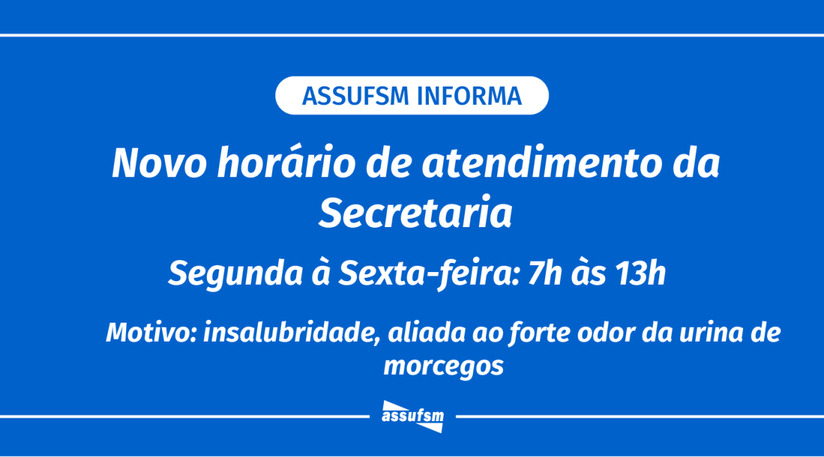 A Assufsm informa que a partir do dia 1º de agosto, segunda-feira, a Sede Administrativa do Sindicato passará a atender em novo horário: 7h às 13h, de segunda à sexta-feira.