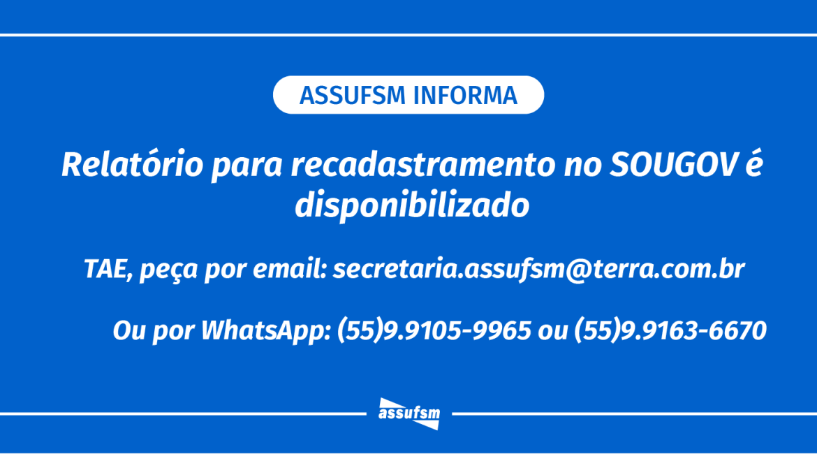 O ou a TAE que desejar obter o documento pode pedir, preferencialmente, através do email: secretaria.assufsm@terra.com.br ou pelos WhatsApps: (55)9.9105-9965 ou (55)9.9163-6670.