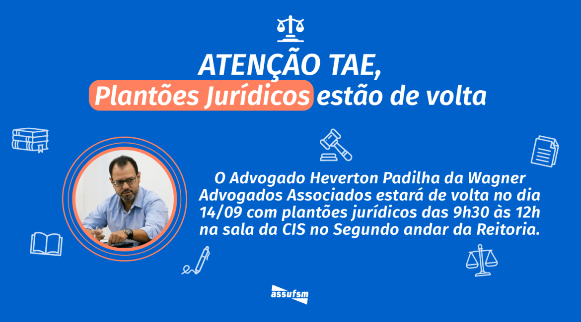 Atenção TAE, no dia 14 de setembro, o Plantão Jurídico irá retornar na Sede Administrativa da Assufsm. Os atendimentos jurídicos serão realizados na Sala da CIS, no segundo andar do Prédio da Reitoria, ao lado da Secretaria da Assufsm, todas as quartas-feiras de manhã, das 9h30min às 12h.