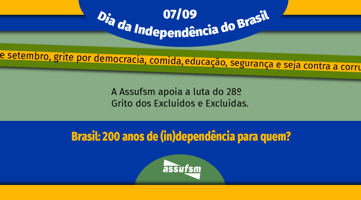 Nesse dia 7 de setembro, grite também por democracia, comida, educação, segurança e seja contra a corrupção. Como é tradicional, o Grito dos e das Excluídas também marca presença e a 28ª edição da marcha organizada pelas pastorais sociais ligadas à Conferência Nacional dos Bispos do Brasil (CNBB) traz como lema este ano “Brasil: 200 anos de (in)dependência para quem?”. Fruto da Campanha da Fraternidade de 1995, o tema permanente do Grito é “Vida em Primeiro Lugar”.