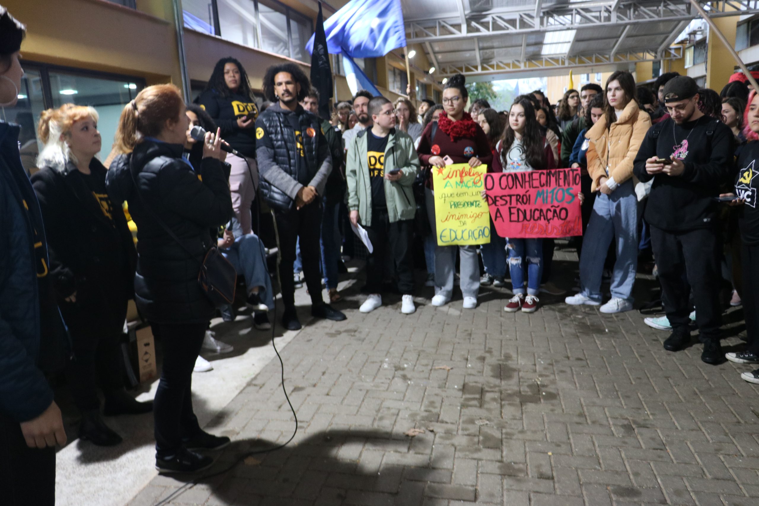 A chuva e o frio não foram páreos para o sentimento de indignação que reuniu centenas de estudantes, professores, técnicos administrativos em Educação e trabalhadores terceirizados da UFSM, no final da tarde de segunda-feira, 10. Em frente ao prédio 17, a Assembleia Geral tocadapelo Diretório Central dos Estudantes (DCE) e apoiada pela Assufsm, Sedufsm, ATENS, Sinasefe e APG debateu sobre o Decreto 11.216 em 30.09.2022 publicado pelo Governo Federal, e sobre os impactos que esse novo contingenciamento causaria na instituição.