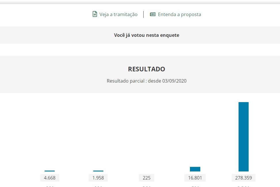 Até o momento 92% das pessoas apontam discordar totalmente da proposta de destruição dos serviços públicos enquanto 6% discordam na maior parte. Isso coloca 98% dos participantes da enquete contrários à proposta de reforma Administrativa de Bolsonaro-Guedes.