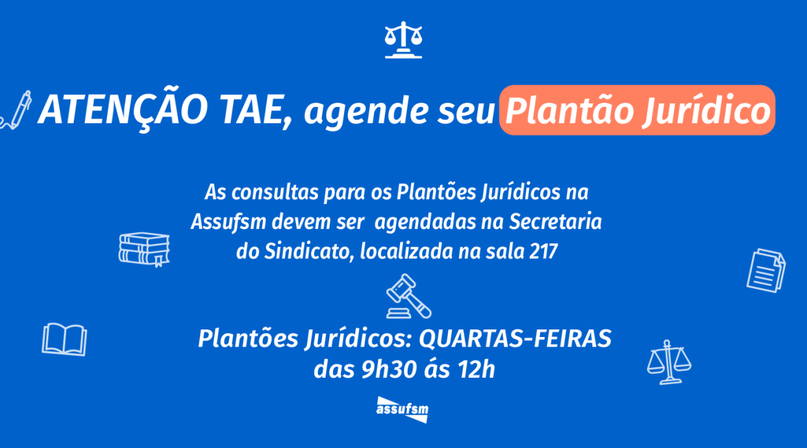 Atenção TAE, o Plantão Jurídico já está de volta na Sede Administrativa da Assufsm. Os atendimentos jurídicos são realizados na Sala da CIS, no segundo andar do Prédio da Reitoria, ao lado da Secretaria da Assufsm, todas as quartas-feiras de manhã, das 9h30min às 12h.