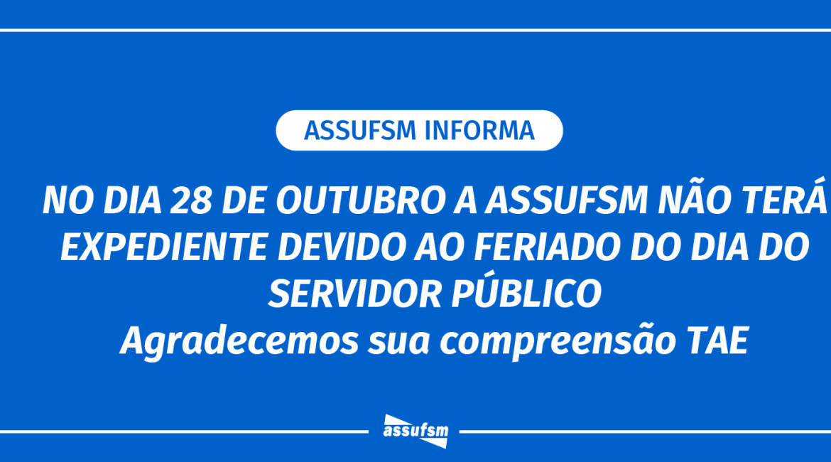 TAE, atenção. No dia 28 de outubro, a Assufsm não terá expediente devido ao feriado do Dia do e da Servidora Pública.