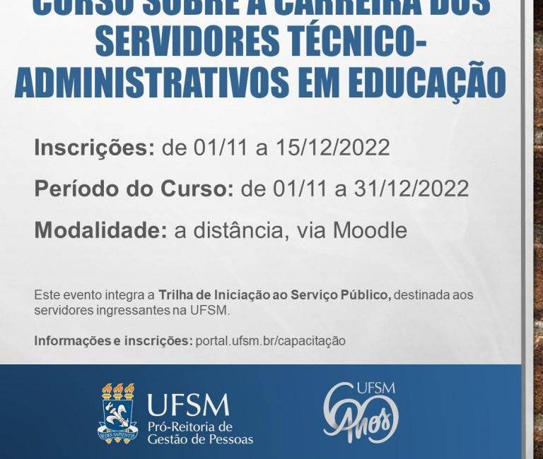 As inscrições podem ser realizadas pelo Portal de Capacitação de 01/11 a 15/12/2022, sendo que, ao inscrever-se, o servidor será automaticamente matriculado, tendo acesso imediato ao curso no Moodle da UFSM e podendo concluí-lo até o dia 31/12/2022.