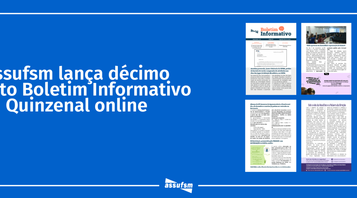 Todas as notícias e informes do Boletim estão completos em nosso site, acesse: ASSUFSM – Associação dos Servidores da Universidade Federal de Santa Maria e fique sempre bem informado(a)!