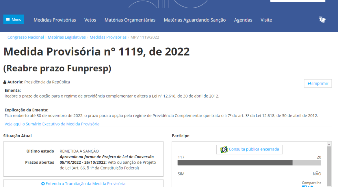 O Senado aprovou a Medida Provisória (MP) 1.119 de 2022, que amplia o prazo para a opção dos servidores(as) públicos(as) federais pelo regime de previdência complementar da Fundação de Previdência Complementar do Servidor Público Federal (Funpresp), que passa a ser de natureza privada. O prazo fixado pela MP é 30 novembro. O texto segue para sanção presidencial.