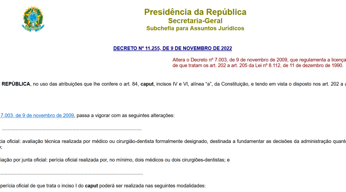 O Decreto 11.255, de 9 de novembro de 2022, publicado no dia 10 de novembro pelo Executivo Federal, alterou as regras da perícia oficial para concessão das licenças de saúde. Assim, a partir de 17 de janeiro de 2023, servidoras e servidores públicos federais que precisarem solicitar licença por motivo de saúde passarão a contar com novas modalidades para a realização das avaliações periciais. O novo regulamento modifica o Decreto 7.003, de 9 de novembro de 2009, ampliando alternativas e alterando prazos para a realização do procedimento.
