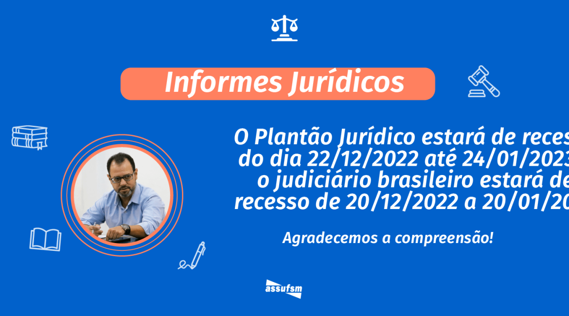 Atenção TAEs da UFSM, o judiciário Brasileiro, bem como o Plantão Jurídico da Assufsm, já divulgaram suas datas de recesso forense para dezembro de 2022 e janeiro de 2023.