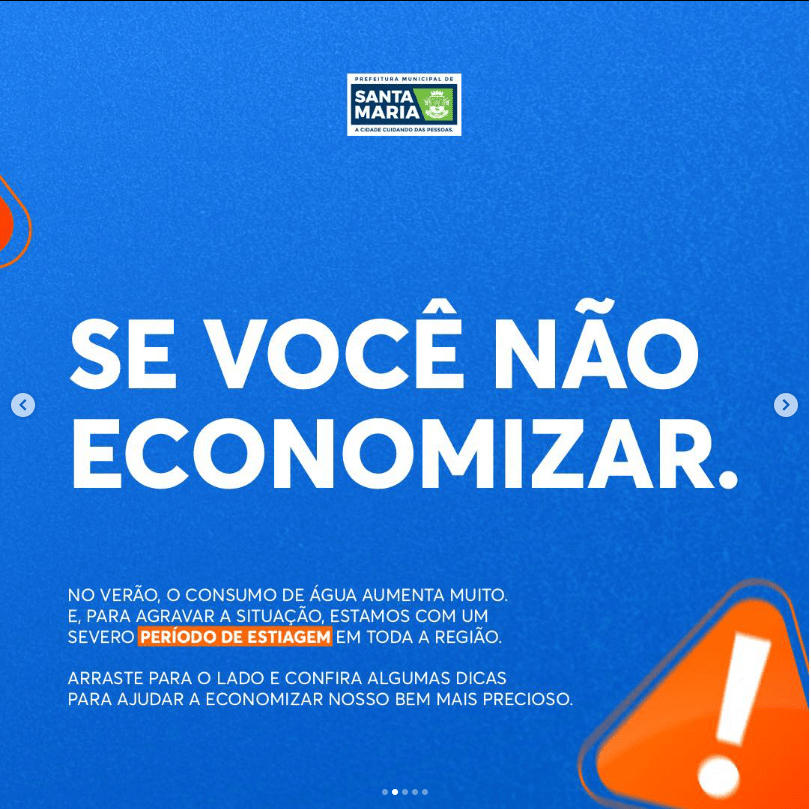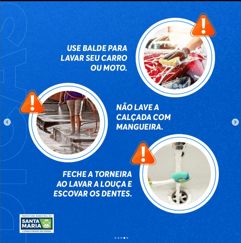 Durante o verão há um aumento de consumo de água e para ajudar durante esse severo período de estiagem, a Prefeitura de Santa Maria publicou em suas redes sociais dicas para economizar água, confira: