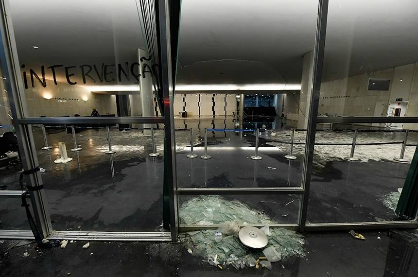 Logo na chegada ao Senado, entrando pelo Salão Negro, todas as vidraças encontram-se quebradas; outras foram pichadas. Os equipamentos que realizam raio x para reforçar a segurança de visitantes, também não escaparam da ação dos vândalos. Os invasores usaram mangueiras de combate a incêndio e boa parte do piso do Salão Negro e dos carpetes foram molhados e danificados.
