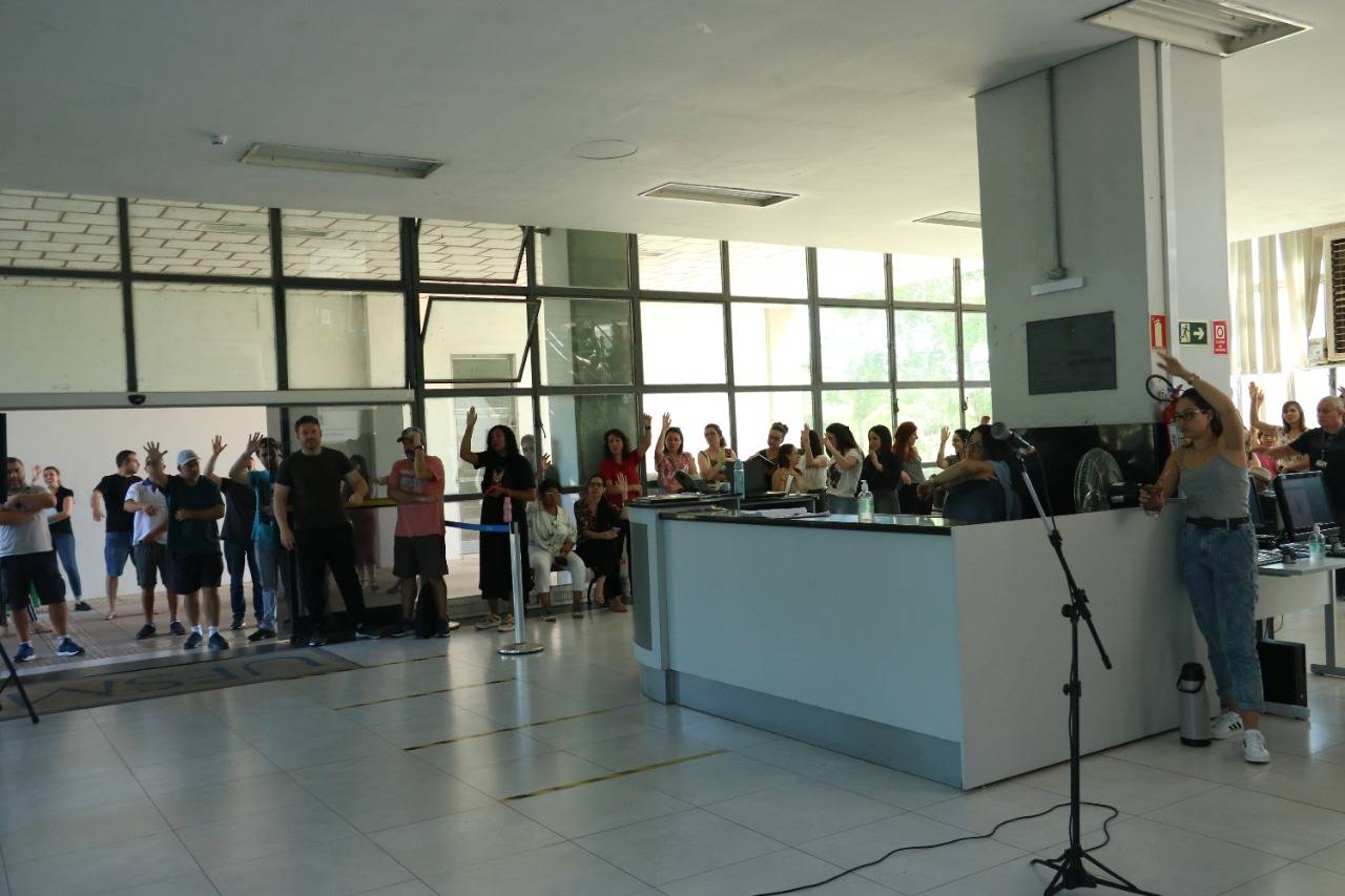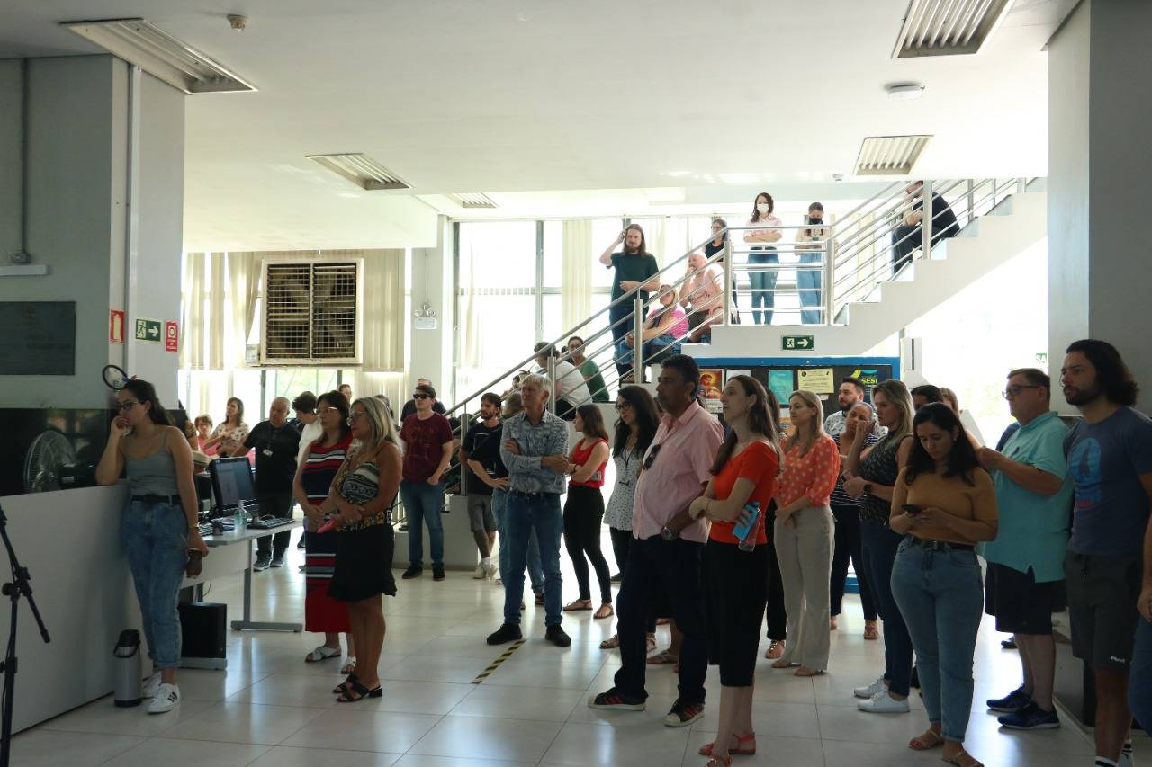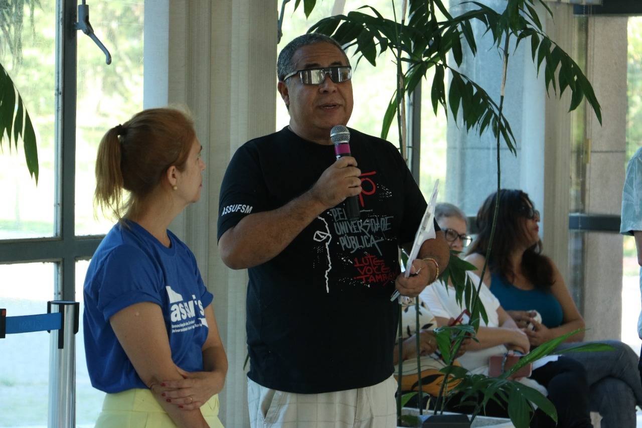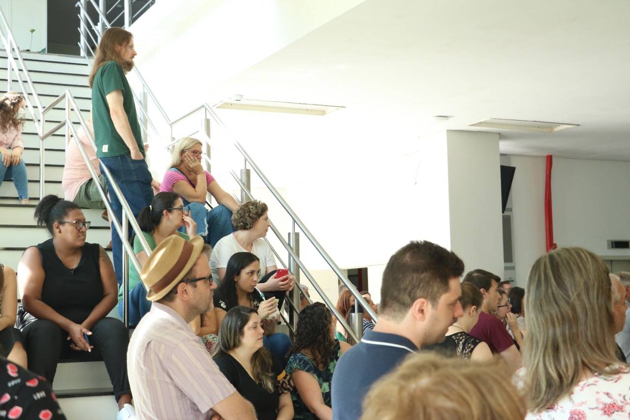 Na manhã de hoje (11), reuniram-se cerca de cem Técnico-Administrativos e Administrativas em Educação da UFSM e coordenadores da Assufsm em Assembleia Geral, no hall da Reitoria, para discutir a proposta da Reitoria sobre o horário reduzido na Universidade.