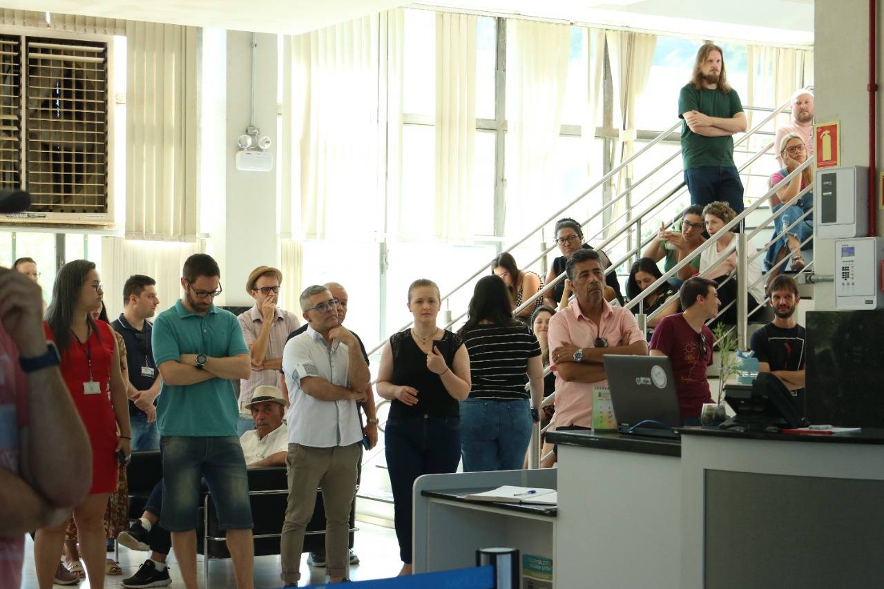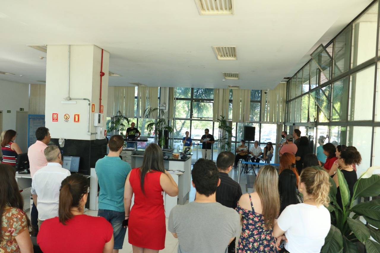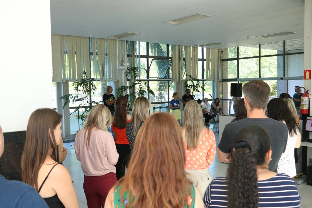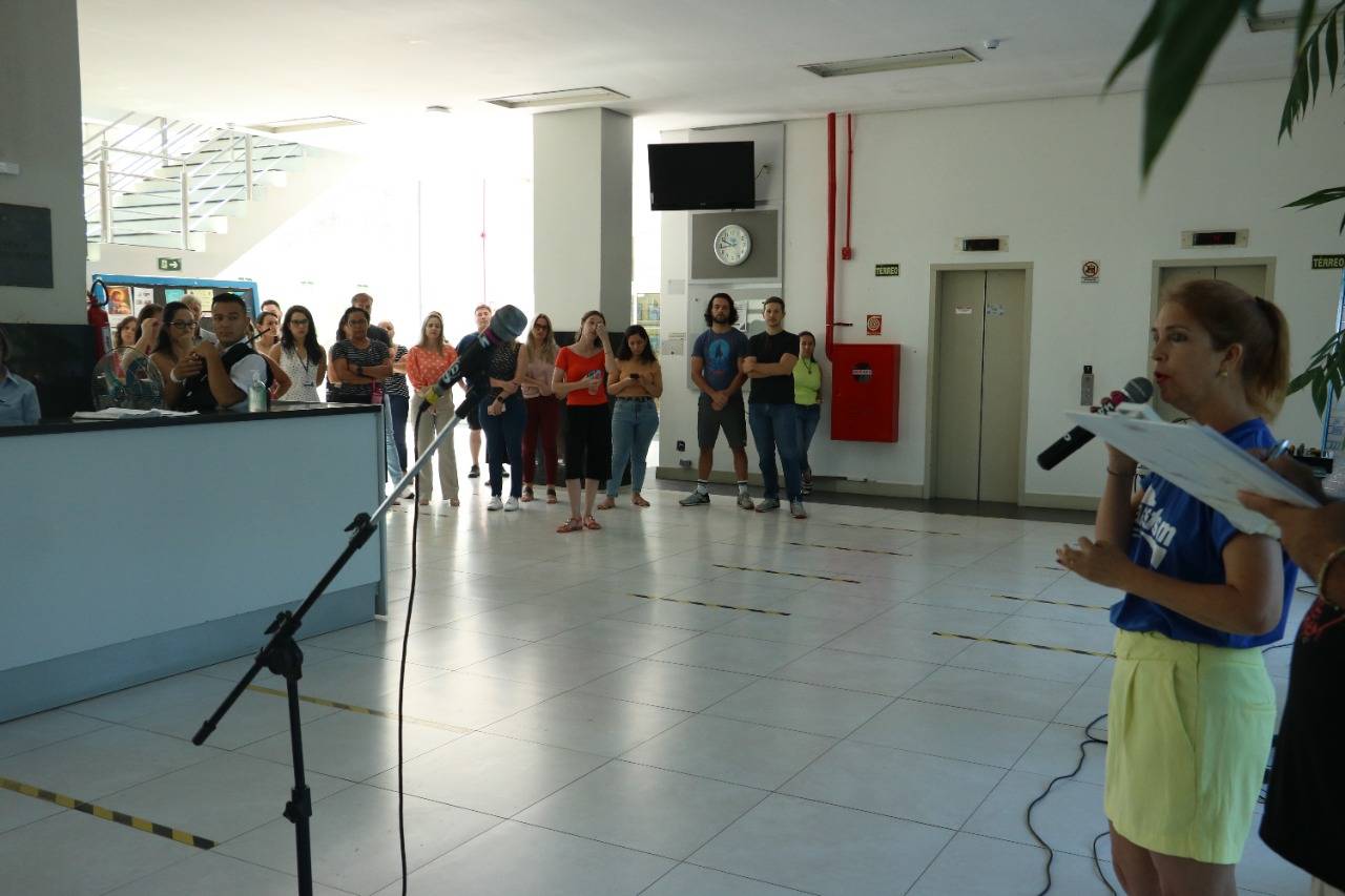 Na manhã de hoje (11), reuniram-se cerca de cem Técnico-Administrativos e Administrativas em Educação da UFSM e coordenadores da Assufsm em Assembleia Geral, no hall da Reitoria, para discutir a proposta da Reitoria sobre o horário reduzido na Universidade.